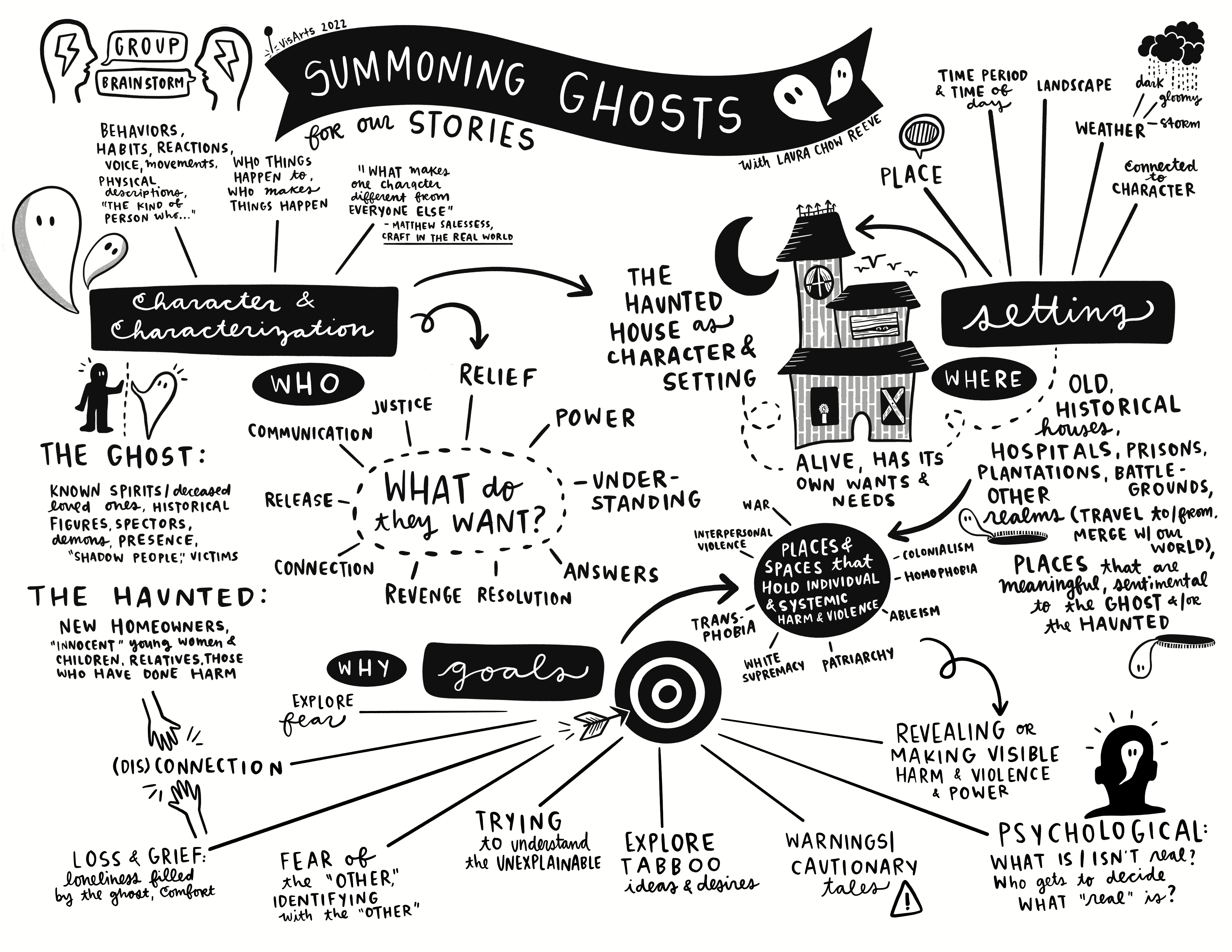 I just finished up teaching my fall writing class at VisArts. This time, I taught a new class on writing ghost stories. In our first session, we did a group brainstorm on the who/where/why of ghost stories. I illustrated the notes for my students after there was a request, so I’m sharing them with you now: