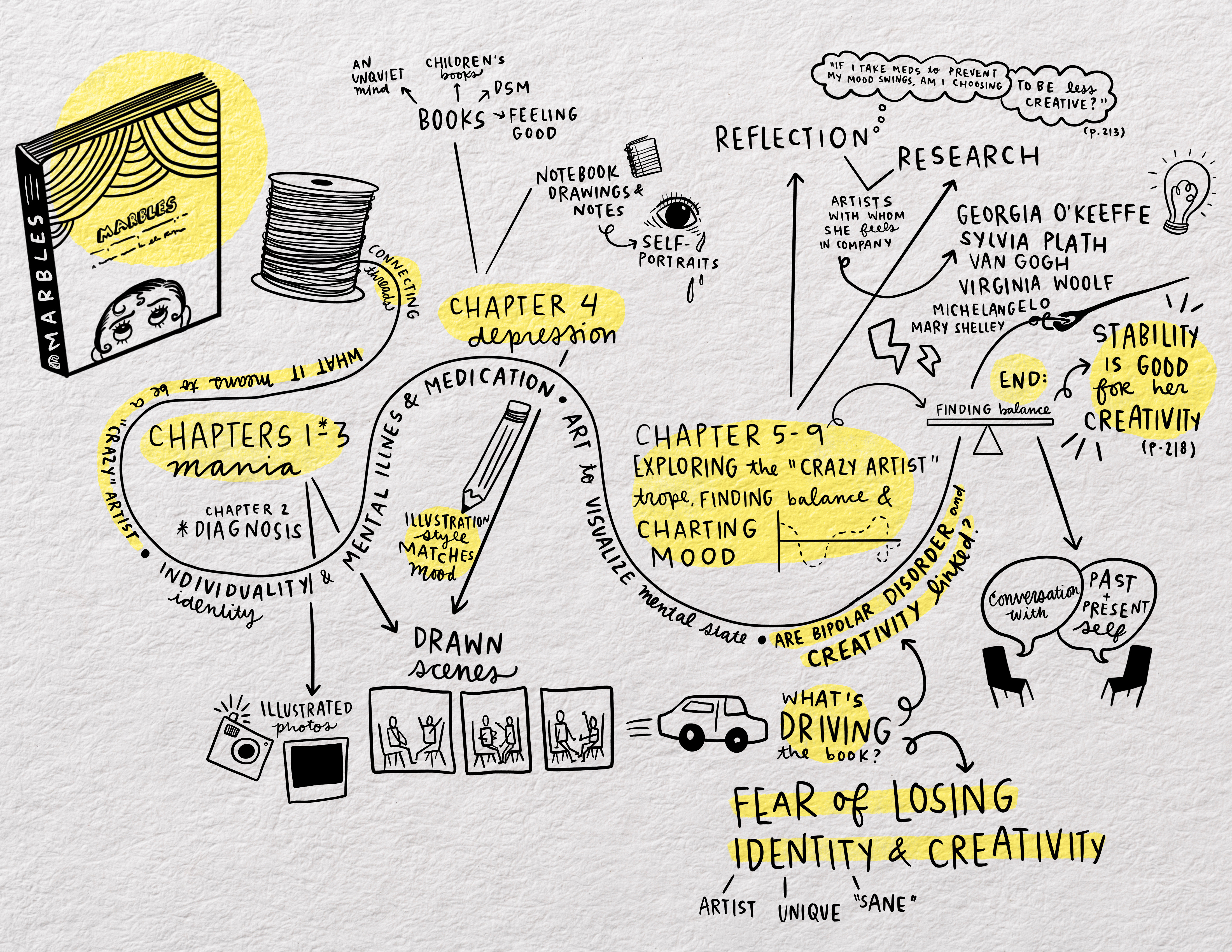Marbles: Mania, Depression, Michelangelo, and Me: A Graphic Memoir by Ellen Forney : When I was reading Marbles, I was thinking a lot about the structures of graphic memoirs/nonfiction books. Below is my attempt at mapping what I saw in this one.