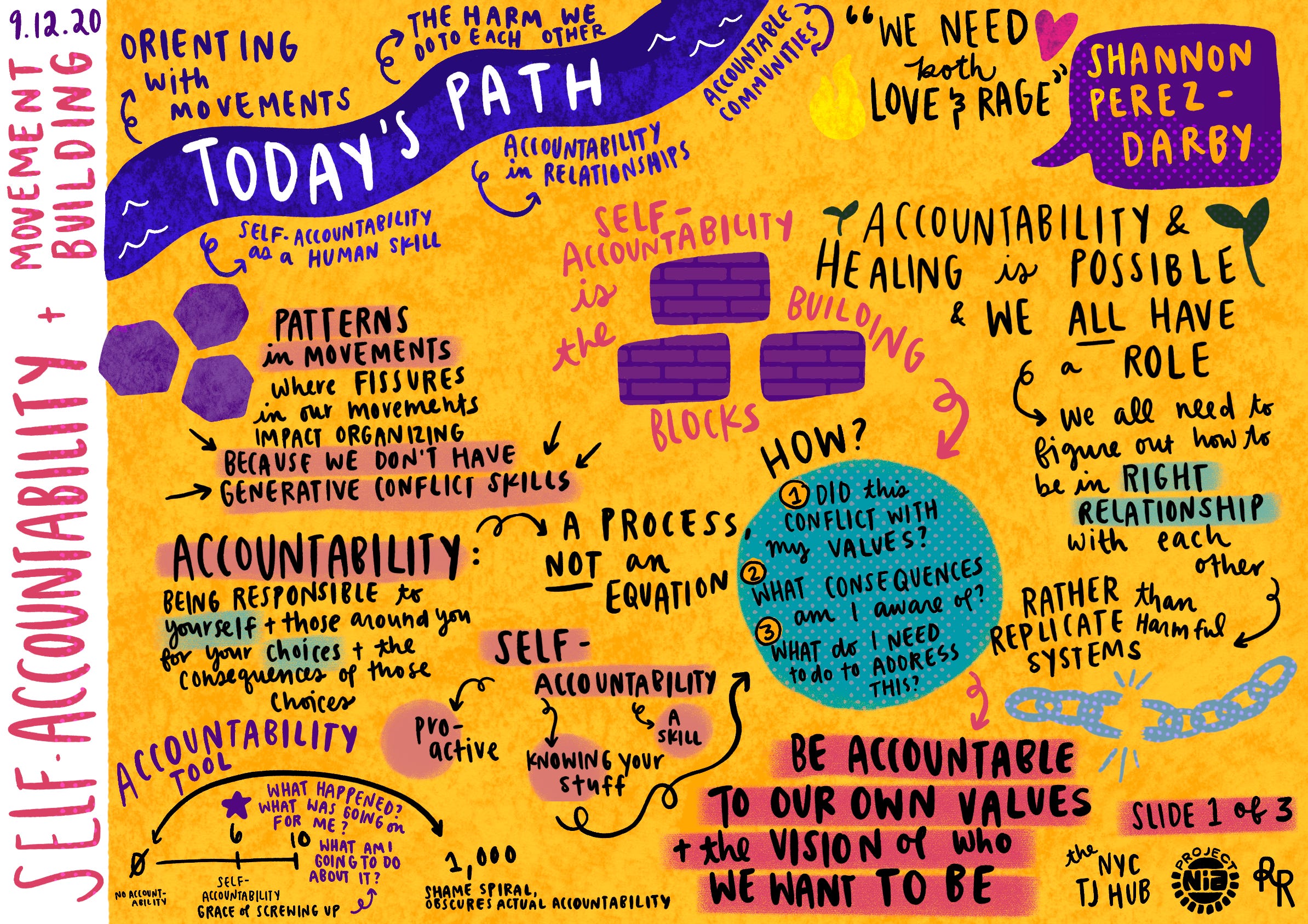 Below, is this first session of the series: Self-Accountability & Movement Building with Shannon Perez-Darby. I used 3 slides for the 2 hour session, and I can see myself playing with a lot here that I still like to do: textures, layering, using shapes to privilege certain key information, etc. I also see some hesitancy and uncertainty around how to use space, there is a rushed nature to my handwriting and even in my placement of words. I can also tell that I’m trying to use exact language or terms, rather than trusting myself to synthesize.